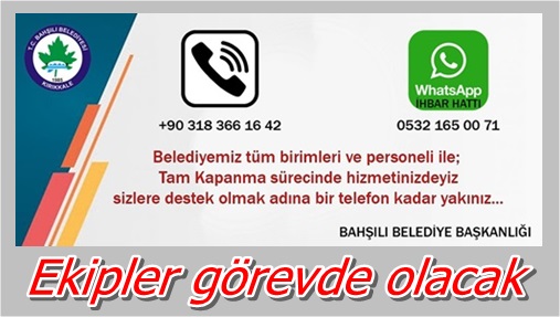 Covid-19 virüsü nedeniyle tam kapanmaya geçilirken, Bahşılı Belediyesi’nin tüm birimleri ve personeli ile kapanma süresince görevde olacağı bildirildi. Belediye, kapanmayla ilgili hazırlıklarını yaparken, vatandaÅŸların hizmette aksama yaÅŸamamaları için ekiplerin göreve devam edeceÄŸi belirtildi. Belediye’den konuyla ilgili açıklama yapıldı ve “Belediyemiz tüm birimleri ve personeli ile tam kapanma sürecinde hizmetinizde olacak. Sizlere destek olmak adına bir telefon kadar yakınız” bilgisi verildi. VatandaÅŸların her konuda 0 318 366 16 42 numaralı Belediye hattı ve 0 532 165 0071 numaralı WhatsApp hattını arayabilecekleri belirtildi.