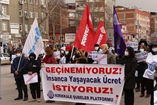 TÜİK rakamları bile son 19 yılın en yüksek enflasyonunu gösteriyor. Ancak Çarşıya, pazara, mutfağa yansıyan zamlar yaşadığımız hayat pahalılığının TÜİK enflasyonun en az iki katı olduğunu gösteriyor. Hem açlık hem de yoksulluk sınırı %55 arttı. Dört kişilik bir ailenin açlık sınırı 4 bin TL’yi, yoksulluk sınırı 13 bin TL’yi aştı. Halkın cebinden alınıp piyasaya sürülen milyarca dolarla döviz kuru 3-4 puan düşürüldü. Buna rağmen yılın başında 7,40 TL olan dolar kuru 13,5 TL üzerinde kalmaya devam etti. Biz insanca yaşamanın gereği olan ücret istiyoruz” dedi.