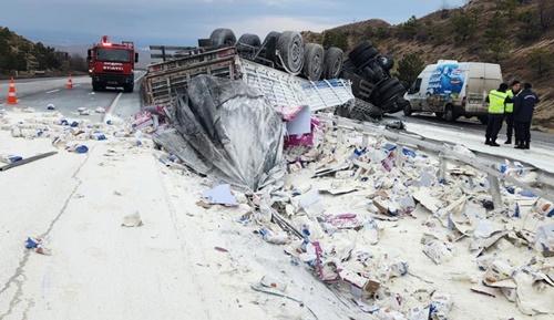 Kırıkkale'de kontrolden çıkan tırın devrilmesi sonucu sürücü yaralandı, dorsede yüklü tonlarca un etrafa saçıldı. Kaza, Kırıkkale-Çorum D200 kara yolunun 57. kilometresinde meydana geldi. Edinilen bilgiye göre, A.K. (52) idaresindeki 42 CUM 01 plakalı Mercedes marka un yüklü tır, sürücüsünün direksiyon hâkimiyetini kaybetmesi sonucu kontrolden çıkarak devrildi. Dorsede bulunan paketler hâlindeki tonlarca un ise etrafa saçıldı. 112 Acil Çağrı Merkezi'ne yapılan ihbarla olay yerine sağlık, itfaiye, jandarma ve polis ekipleri sevk edildi. Kazada yaralanan sürücü, sağlık ekiplerince olay yerinde yapılan ilk müdahalenin ardından ambulansla hastaneye kaldırıldı. Tedavi altına alınan sürücünün hayati tehlikesinin olmadığı öğrenildi. Kazaya ilişkin inceleme başlatıldı.