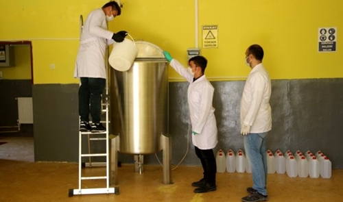 Korona virüs (Covid-19) tedbirleri kapsamında haftalar sonra evlerinden dışarıya çıkan 15-20 yaÅŸ arası genç öÄŸrencilerin ilk iÅŸi dezenfektan üretmek oldu. Kırıkkale'nin Keskin ilçesindeki Mesleki ve Teknik Anadolu Lisesi Kimya Teknolojileri Alanı öÄŸretmenleri, korona virüs (Covid-19) salgınına karşı ihtiyaç duyulan dezenfektan üretimi için gönüllü olarak üretim yapıyor. Evleri üretim atölyesine yakın olan ve kimya bölümünde eÄŸitim gören lise öÄŸrencileri de öÄŸretmenlerine destek amaçlı 4 saatlik dışarı çıkma haklarını dezenfektan üreterek kullandı. Günlük 10 ton dezenfektan üretim kapasitesine sahip atölyede saat 11.00'da mesaiye baÅŸlayan öÄŸrenciler, 15.00'e kadar dezenfektan üretimini sürdürdü. Burada üretilen dezenfektanların, 20 Haziran'da yapılacak Liselere GeçiÅŸ Sınavı (LGS) öncesi okullarda da kullanılması planlanıyor. Üretilen dezenfektanlar birçok bakteri ve virüse karşı etkili ve saÄŸlık açısından da hiçbir sakıncası bulunmuyor. Atölyede sıvı sabun, yüzey temizleyici, bulaşık deterjanı, çamaşır suyu gibi 11 çeÅŸit temizlik malzemesi üretimi de yapılıyor.