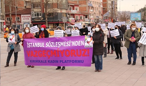 Bugüne kadar sözleÅŸmeyi uygulamadığı için binlerce kadının katledilmesine neden olan siyasi iktidar, sözleÅŸmeyi kendisi için bir tehdit olarak görmüÅŸtür. Üstüne basa basa bir kez daha haykırıyoruz: mevcut iktidar kadınların yaÅŸamı üzerindeki en büyük tehdittir. İstanbul SözleÅŸmesini kendisine bir tehdit olarak gören siyasi iktidarın baskıcı ve ataerkil isteklerine teslim olmayacağız. Biliyoruz ki kadın cinayetleri politiktir, yaÅŸamın her alanında kadın mücadelesi ve kadın dayanışması ile eÅŸit ve özgür bir toplumu hep beraber inÅŸa edeceÄŸiz. YaÅŸam hakkı için, özgürlük için vazgeçmiyoruz, kabul etmiyoruz Kırıkkale Kadın Platformu olarak erkek-devlet ÅŸiddetine karşı yaÅŸam güvencemiz olan İstanbul sözleÅŸmesine sahip çıkmak için bugün alanlardayız. Biz kadınlar, yaÅŸamımızı ve haklarımızı korumak için mücadelemizi yükselterek sürdüreceÄŸiz. İstanbul SözleÅŸmesi YaÅŸatır! İstanbul SözleÅŸmesi’nden Vazgeçmiyoruz!” dedi.
