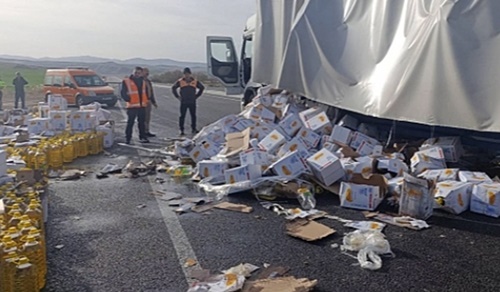 Kırıkkale’de freni patlayan tır karşı şeride geçerek devrildi. Devrilen tırın dorsesinde bulunan sıvı yağ bidonları yola saçıldı. Karayolu bir süre trafiğe kapandı.