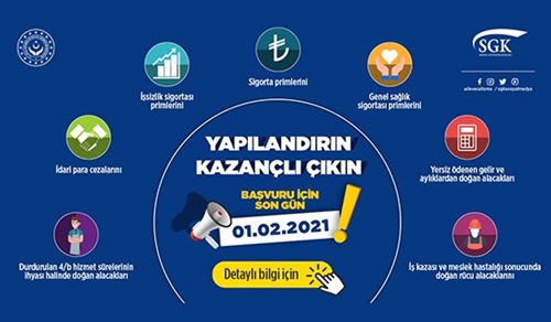 Sosyal Güvenlik Kurumu Başkanlığından yapılan açıklamada "17.11.2020 tarihli ve 31307 sayılı Resmî Gazetede yayımlanarak yürürlüğe giren “Bazı Alacakların Yeniden Yapılandırılması ile Bazı Kanunlarda Değişiklik Yapılması Hakkında Kanun uyarınca Sosyal Güvenlik Kurumuna olan borçların yapılandırılması imkânı sağlanmıştır. 2020/ağustos ayı ve öncesi dönemlere ait ve kesinleşmiş olan; Sigorta primleri, Genel sağlık sigortası primleri, İşsizlik sigortası primleri, İdari para cezaları,İş kazası veya meslek hastalığı sonucunda doğan rücu alacakları, Yersiz ödenen gelir ve aylıklardan doğan alacaklar, 4/b (Bağ-Kur) sigortalılarının daha önce durdurulan hizmet sürelerinin ihyası halinde doğacak alacaklar, yapılandırma kapsamındadır. Yapılandırma kapsamında; anapara borçlarınız için gecikme cezası ve gecikme zammı ile faiz uygulanmayacak, bunların yerine borçlarınız Yİ-ÜFE (yurt içi üretici fiyatları endeksi) ile güncellenecektir.''denildi.