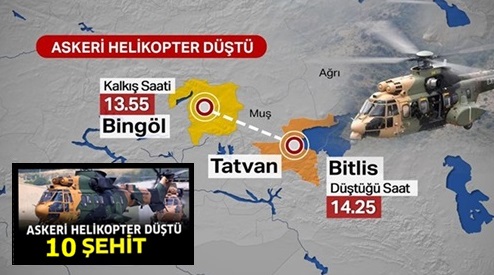 Bingöl'den Tatvan'a gitmek üzere havalanan Cougar tipi helikopter düştü, 10 asker şehit oldu 3 asker yaralandı. Açıklama Milli Savunma Bakanlığı'ndan yapıldı. Bingöl'den Tatvan'a gitmek üzere bugün saat 13.55’te kalkan Kara Kuvvetleri Komutanlığı'na ait Cougar tipi helikopter ile saat 14.25’te irtibat kesildi. Bölgede İHA, CN-235 uçağı ve bir helikopter ile arama çalışmaları başlatıldı.