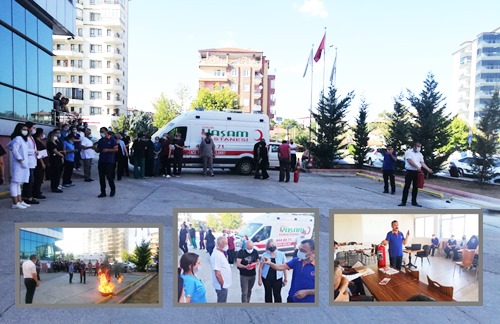 Sunumun ve bilgiye yönelik verilerin ardından hastane otoparkında personelin katılımı ile uygulamalı yangın tatbikatı gerçekleştirildi. AFAD Uzmanı Sedat Yarar, oto parkta güvenli ortamda yakılan ateşi önce kendisi söndürdü ve sonrasında da personele kontrollü şekilde yangının nasıl söndürüleceğini uygulamalı gösterdi. Teorik ve pratik uygulamalar başarılı şekilde gerçekleştirilirken, Deprem öncesinde gerekli standart önlemlerin alınması, deprem esnasında da bilinen kurallara uyulması gerektiği hatırlatıldı. Sonrasında ise kurtarma çalışmalarının daha önce elde edilen tecrübeler ışığında yapılması gerektiği hatırlatıldı.