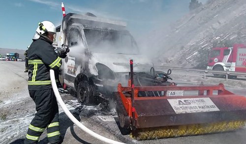 Kırıkkale'nin Yahşihan ilçesinde seyir halindeki yol süpürme kamyonunda çıkan yangın, itfaiye ekiplerince söndürüldü. M.B.Ç. idaresindeki 06 BLF 988 plakalı yol süpürme aracı, Kırıkkale-Ankara kara yolu Organize Sanayi Bölgesi yakınlarında motor kısmından yanmaya başladı. Kamyondan çıkan alevleri fark eden sürücü, aracı yol kenarına park ederek itfaiye ekiplerine haber verdi. Yahşihan Belediyesi itfaiye ekiplerince yangın söndürüldü, kamyonda hasar oluştu. Yangın nedeniyle ulaşım bir süre aksadı.